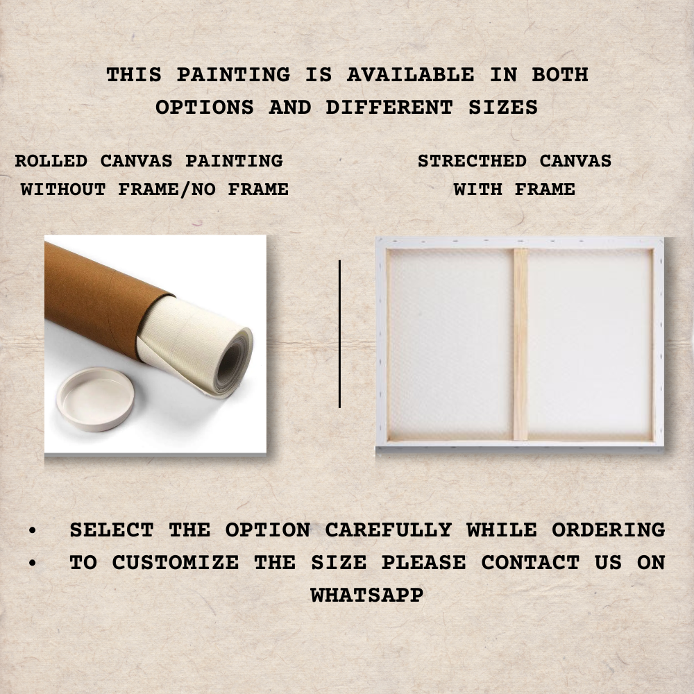 • The painting print will be on cotton canvas that has been rolled up in a corrugated tube with extra margins for framing. Please choose a suitable frame from your local market based on home aesthetics, as they will not be ready to hang and we do not advise using them as is.